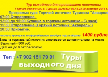 Программа тура Горячий источник Туринска "Акварель" 07:00 Отправление из г.Екатеринбурга ул.Челюскинцев д.