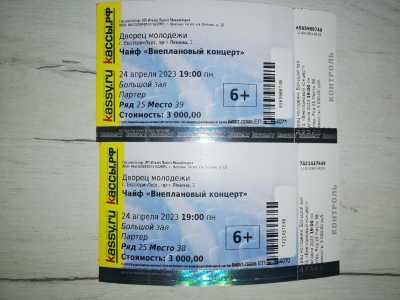 Продам 2 билета на "Чайф". По цене 2500 р. каждый билет. Концерт состоится 24.04.2023г.