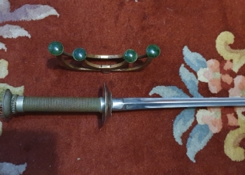 Рукоять с медной оплёткой. Вторая гарда бронзовая с натуральными малахитами. Сгодится в качестве стильного подарка.