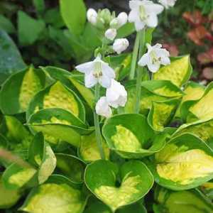 Эффектный и нарядный сорт: листья ярко-зеленые с золотистым центром, а на высоких стеблях распускаются белоснежные цветки.